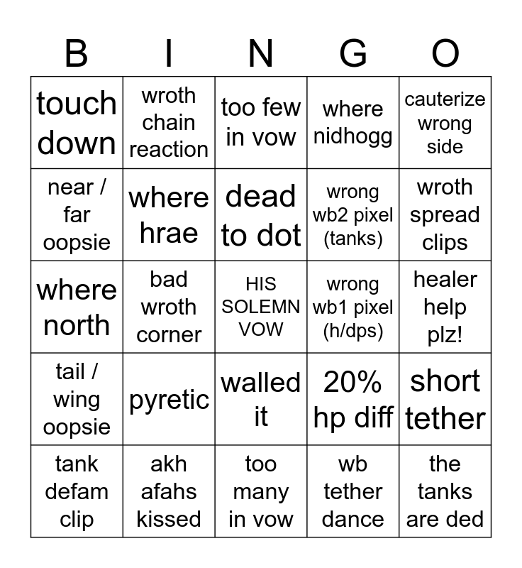 This bingo card has a free space and 24 words: pyretic, akh afahs kissed, dead to dot, tank defam clip, cauterize wrong side, touch down, near / far oopsie, wroth chain reaction, wrong wb1 pixel (h/dps), walled it, wrong wb2 pixel (tanks), where north, 20% hp diff, short tether, where hrae, wb tether dance, healer help plz!, too few in vow, wroth spread clips, bad wroth corner, the tanks are ded, tail / wing oopsie, where nidhogg and too many in vow.