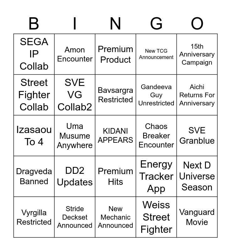 This bingo card has a free space and 24 words: DD2 Updates, Stride Deckset Announced, Bavsargra Restricted, Vyrgilla Restricted, 15th Anniversary Campaign, SEGA IP Collab, Street Fighter Collab, Amon Encounter, Chaos Breaker Encounter, Premium Hits, Gandeeva Guy Unrestricted, Izasaou To 4, Energy Tracker App, Next D Universe Season, SVE VG Collab2, Weiss Street Fighter, SVE Granblue, Premium Product, Aichi Returns For Anniversary, Uma Musume Anywhere, Vanguard Movie, Dragveda Banned, New TCG Announcement and New Mechanic Announced.
