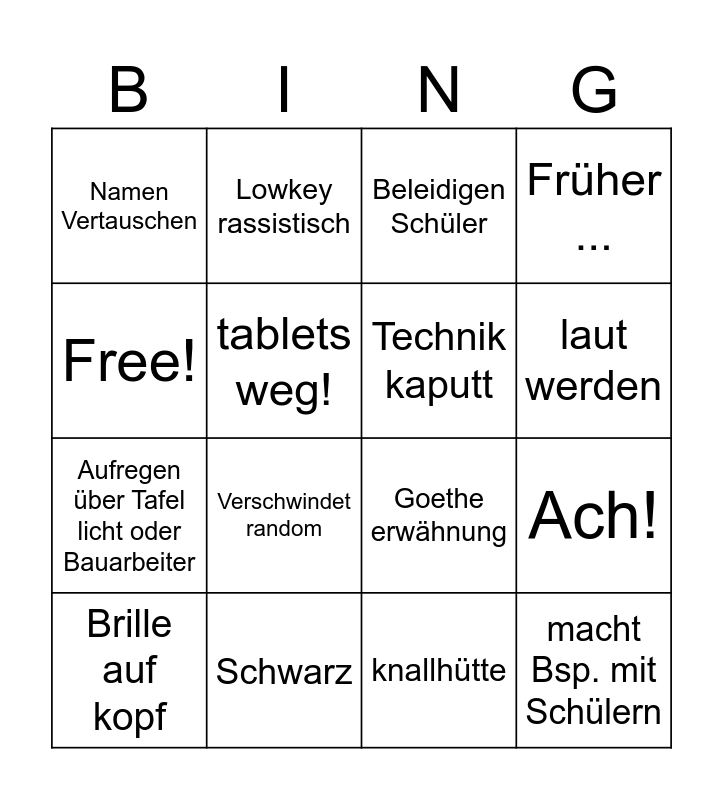 This bingo card has 16 words: Schwarz, Ach!, Beleidigen Schüler, Namen Vertauschen, Aufregen über Tafel licht oder Bauarbeiter, Lowkey rassistisch, Goethe erwähnung, knallhütte, Free!, tablets weg!, Brille auf kopf, Früher ..., Verschwindet random, laut werden, Technik kaputt and macht Bsp. mit Schülern.