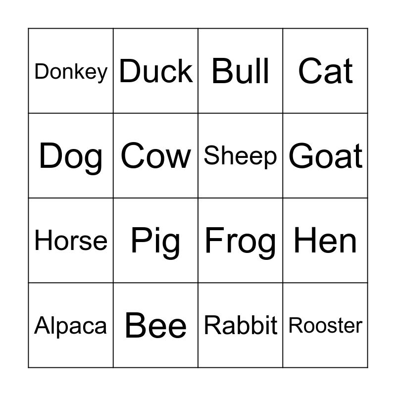 This bingo card has 16 words: Alpaca, Bee, Bull, Cat, Dog, Duck, Frog, Hen, Donkey, Cow, Rabbit, Goat, Horse, Pig, Sheep and Rooster.