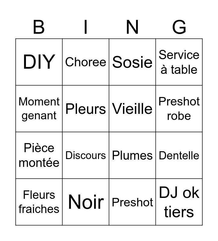 This bingo card has 16 words: Noir, Dentelle, Sosie, DIY, Pièce montée, Choree, Plumes, Preshot, Moment genant, Pleurs, Fleurs fraiches, Service à table, Discours, Preshot robe, Vieille and DJ ok tiers.
