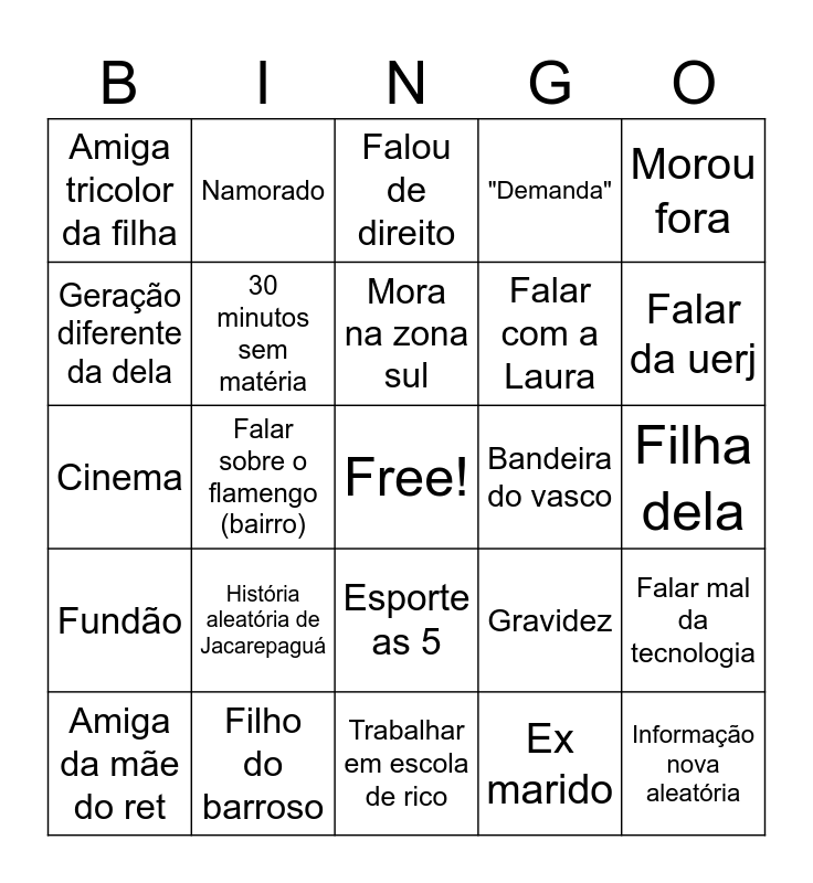 This bingo card has a free space and 24 words: Amiga da mãe do ret, História aleatória de Jacarepaguá, Mora na zona sul, Ex marido, Morou fora, Amiga tricolor da filha, Namorado, Falou de direito, Bandeira do vasco, Filha dela, Cinema, 30 minutos sem matéria, Gravidez, Falar mal da tecnologia, Geração diferente da dela, Filho do barroso, Trabalhar em escola de rico, "Demanda", Falar da uerj, Fundão, Falar sobre o flamengo (bairro), Esporte as 5, Falar com a Laura and Informação nova aleatória.