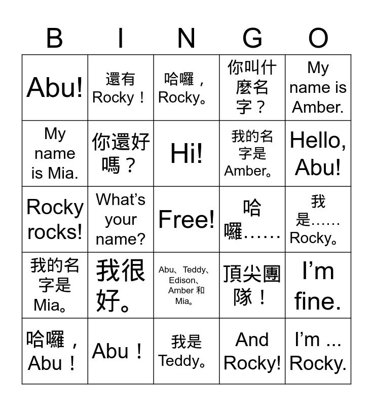 This bingo card has a free space and 38 words: Hi, Edison!, 嗨,Edison!, Are you OK?, 你還好嗎?, I’m fine., 我很好。, Hi!, 嗨!, My name is Amber., 我的名字是 Amber。, What’s your name?, 你叫什麼名字?, I’m ... Rocky., 我是……Rocky。, My name is Mia., 我的名字是 Mia。, Hello, Rocky., 哈囉,Rocky。, Hello ..., 哈囉……, Abu!, Abu!, Hello, Abu!, 哈囉,Abu!, I’m Teddy., 我是 Teddy。, How are you?, 你好嗎?, I’m fine., 我很好。, Abu, Teddy, Edison, Amber, and Mia., Abu、Teddy、Edison、Amber 和 Mia。, And Rocky!, 還有 Rocky!, A-TEAM!, 頂尖團隊!, Rocky rocks! and Rocky 太帥了!.
