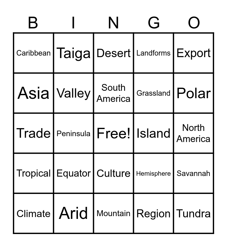 This bingo card has a free space and 24 words: Equator, Arid, South America, Climate, Export, Caribbean, Asia, Taiga, Island, Culture, Grassland, Trade, Hemisphere, Savannah, Valley, Region, North America, Desert, Polar, Peninsula, Tundra, Tropical, Landforms and Mountain.