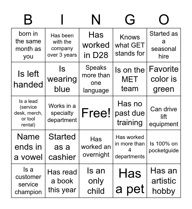 This bingo card has a free space and 24 words: Started as a cashier, Has read a book this year, Speaks more than one language, Is a customer service champion, Started as a seasonal hire, born in the same month as you, Is left handed, Has been with the company over 3 years, Has no past due training, Has worked an overnight, Is on the MET team, Is a lead (service desk, merch, or tool rental), Has worked in more than 4 departments, Is 100% on pocketguide, Is wearing blue, Has a pet, Can drive lift equipment, Has worked in D28, Favorite color is green, Works in a specialty department, Has an artistic hobby, Name ends in a vowel, Knows what GET stands for and Is an only child.