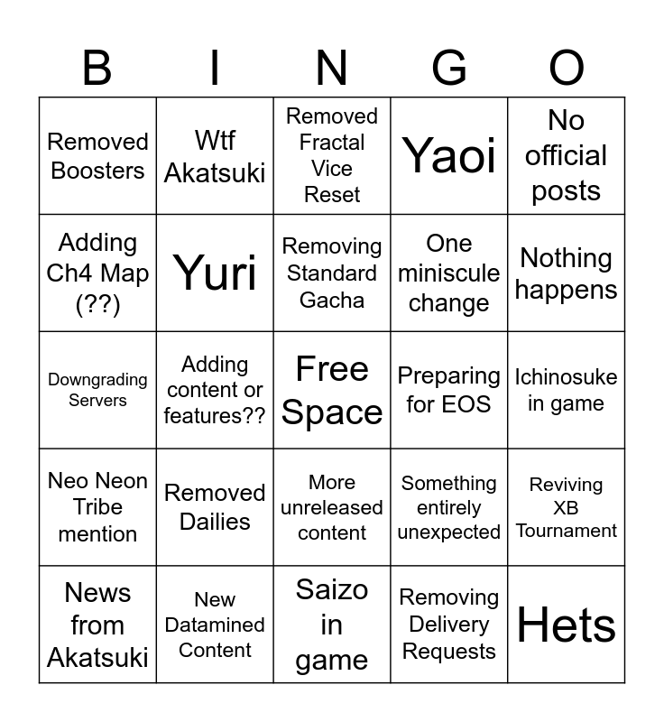 This bingo card has a free space and 24 words: Removed Dailies, New Datamined Content, Removing Standard Gacha, News from Akatsuki, No official posts, Removed Boosters, Adding Ch4 Map (??), Wtf Akatsuki, Preparing for EOS, More unreleased content, One miniscule change, Downgrading Servers, Something entirely unexpected, Reviving XB Tournament, Yuri, Removing Delivery Requests, Ichinosuke in game, Removed Fractal Vice Reset, Nothing happens, Adding content or features??, Hets, Neo Neon Tribe mention, Yaoi and Saizo in game.