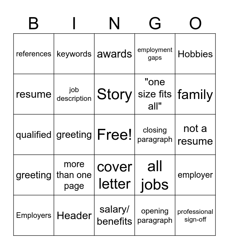 This bingo card has a free space and 24 words: more than one page, Header, Story, Employers, Hobbies, references, resume, keywords, closing paragraph, cover letter, "one size fits all", qualified, all jobs, employer, job description, opening paragraph, not a resume, awards, family, greeting, professional sign-off, greeting, employment gaps and salary/ benefits.