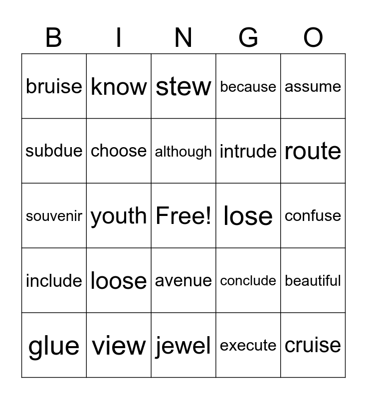 This bingo card has a free space and 29 words: glue, flute, youth, accuse, bruise, stew, choose, loose, lose, view, confuse, cruise, jewel, execute, route, cartoon, avenue, include, assume, souvenir, conclude, pursuit, intrude, subdue, because, know, beautiful, although and except.