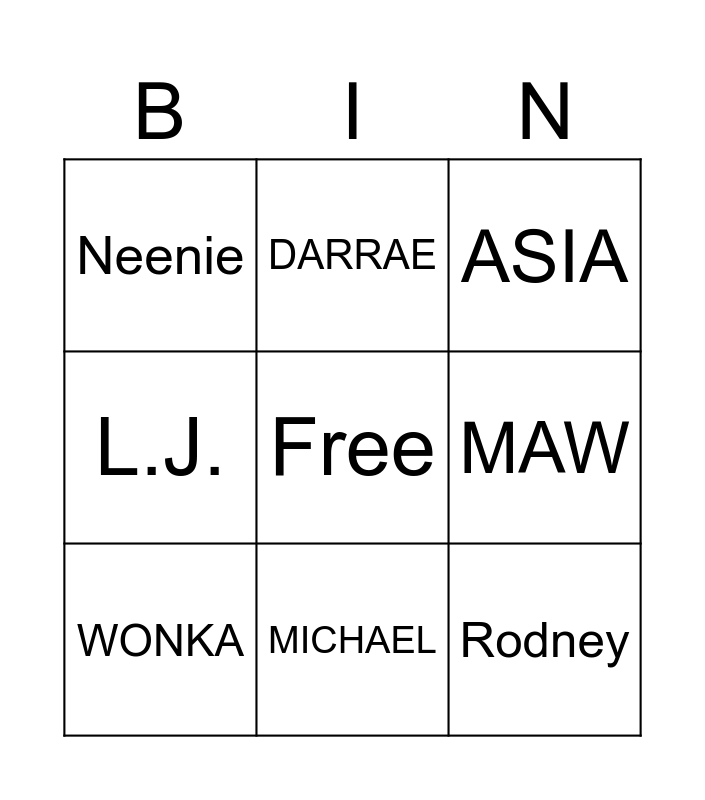This bingo card has a free space and 8 words: MAW, ASIA, DARRAE, WONKA, Neenie, Rodney, L.J. and MICHAEL.