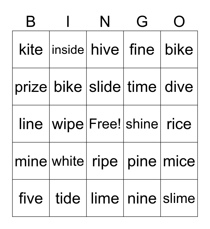 This bingo card has a free space and 24 words: white, tide, slide, five, bike, kite, prize, inside, shine, ripe, time, line, pine, mice, bike, nine, rice, hive, dive, wipe, slime, mine, fine and lime.
