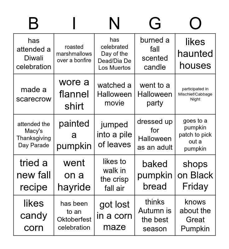 This bingo card has 47 words: went apple picking, jumped into a pile of leaves, carved a pumpkin, got lost in a corn maze, went on a hayride, attended a fall festival, roasted marshmallows over a bonfire, decorated for autumn, made a scarecrow, drank a pumpkin spice drink, wore a flannel shirt, burned a fall scented candle, shops on Black Friday, baked pumpkin bread, made chili from scratch, likes hot apple cider, watched a Halloween movie, dressed up for Halloween as an adult, handed out candy to trick-or-treaters, likes haunted houses, painted a pumpkin, thinks Autumn is the best season, has attended a Diwali celebration, went to a Halloween party, has gone leaf peeping, participated in Mischief/Cabbage Night, likes candy corn, decorates for Halloween, likes to walk in the crisp fall air, tried a new fall recipe, bought something pumpkin flavored, helped someone rake leaves, has attended Atlanta Pride, watches the World Series, has been to Oktoberfest in Munich, has been to an Oktoberfest celebration, goes to a pumpkin patch to pick out a pumpkin, likes s'mores, watches college football, has bobbed for apples, knows about the Great Pumpkin, has celebrated Day of the Dead/Dia De Los Muertos, attended the Macy's Thanksgiving Day Parade, has had a mooncake, prefers sweet potato pie to pumpkin pie, has participated in No Shave November and has participated in a Breast Cancer walk.