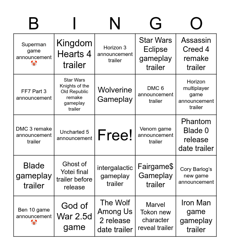 This bingo card has a free space and 24 words: Ghost of Yotei final trailer before release, God of War 2.5d game, Wolverine Gameplay, Ben 10 game announcement š¤”, Assassin Creed 4 remake trailer, Superman game announcementš¤”, FF7 Part 3 announcement, Kingdom Hearts 4 trailer, Venom game announcement trailer, intergalactic gameplay trailer, DMC 6 announcement trailer, DMC 3 remake announcement trailer, Fairgame$ Gameplay trailer, Cory Barlogās new game announcement, Star Wars Knights of the Old Republic remake gameplay trailer, Marvel Tokon new character reveal trailer, Phantom Blade 0 release date trailer, Horizon 3 announcement trailer, Horizon multiplayer game announcement trailer, Uncharted 5 announcement, Iron Man game gameplay trailer, Blade gameplay trailer, Star Wars Eclipse gameplay trailer and The Wolf Among Us 2 release date trailer.