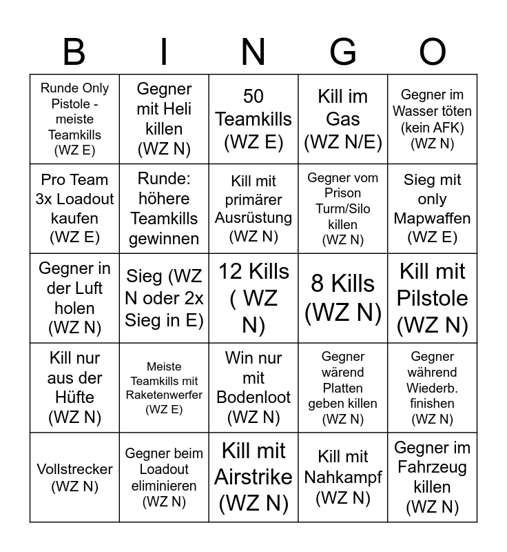 This bingo card has a free space and 24 words: Meiste Teamkills mit Raketenwerfer (WZ E), Gegner beim Loadout eliminieren (WZ N), Kill mit primärer Ausrüstung (WZ N), Vollstrecker (WZ N), Gegner im Wasser töten (kein AFK) (WZ N), Runde Only Pistole - meiste Teamkills (WZ E), Pro Team 3x Loadout kaufen (WZ E), Gegner mit Heli killen (WZ N), 8 Kills (WZ N), Win nur mit Bodenloot (WZ N), Gegner vom Prison Turm/Silo killen (WZ N), Gegner in der Luft holen (WZ N), Gegner wärend Platten geben killen (WZ N), Gegner während Wiederb. finishen (WZ N), Runde: höhere Teamkills gewinnen, Kill mit Nahkampf (WZ N), Kill mit Pilstole (WZ N), 50 Teamkills (WZ E), Sieg mit only Mapwaffen (WZ E), Sieg (WZ N oder 2x Sieg in E), Gegner im Fahrzeug killen (WZ N), Kill nur aus der Hüfte (WZ N), Kill im Gas (WZ N/E) and Kill mit Airstrike (WZ N).