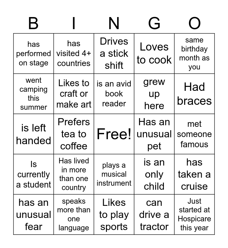 This bingo card has a free space and 26 words: plays a musical instrument, can drive a tractor, is an avid book reader, speaks more than one language, same birthday month as you, has performed on stage, went camping this summer, has visited 4+ countries, met someone famous, is an only child, grew up here, is left handed, has taken a cruise, has an unusual fear, Prefers tea to coffee, Collects something, Loves to cook, Is currently a student, Drives a stick shift, Just started at Hospicare this year, Had braces, Likes to play sports, Has an unusual pet, Has lived in more than one country, Likes to craft or make art and Has changed a tire.