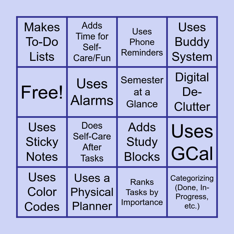 This bingo card has 16 words: Uses a Physical Planner, Uses GCal, Uses Phone Reminders, Makes To-Do Lists, Uses Sticky Notes, Adds Time for Self-Care/Fun, Adds Study Blocks, Ranks Tasks by Importance, Free!, Uses Alarms, Uses Color Codes, Uses Buddy System, Does Self-Care After Tasks, Digital De-Clutter, Semester at a Glance and Categorizing (Done, In-Progress, etc.).