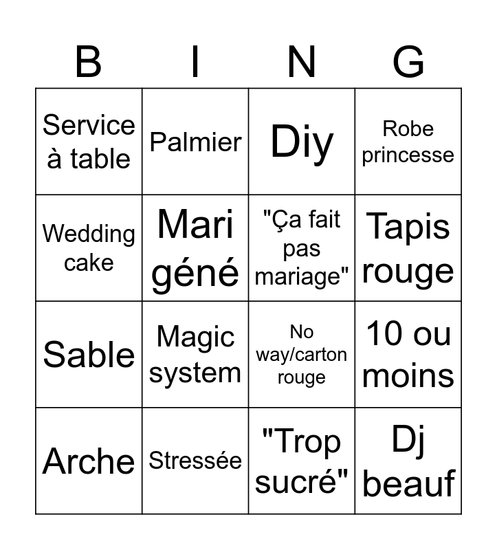 This bingo card has 16 words: Stressée, 10 ou moins, Diy, Service à table, Sable, Palmier, No way/carton rouge, "Trop sucré", Wedding cake, Mari géné, Arche, Robe princesse, Magic system, Tapis rouge, "Ça fait pas mariage" and Dj beauf.