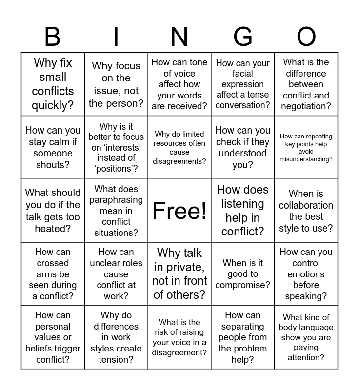 This bingo card has a free space and 24 words: How can unclear roles cause conflict at work?, Why do differences in work styles create tension?, Why do limited resources often cause disagreements?, How can personal values or beliefs trigger conflict?, What is the difference between conflict and negotiation?, Why fix small conflicts quickly?, How can you stay calm if someone shouts?, Why focus on the issue, not the person?, How does listening help in conflict?, Why talk in private, not in front of others?, How can you check if they understood you?, What should you do if the talk gets too heated?, When is it good to compromise?, How can you control emotions before speaking?, Why is it better to focus on ‘interests’ instead of ‘positions’?, How can separating people from the problem help?, When is collaboration the best style to use?, How can tone of voice affect how your words are received?, How can repeating key points help avoid misunderstanding?, What does paraphrasing mean in conflict situations?, What kind of body language show you are paying attention?, How can crossed arms be seen during a conflict?, How can your facial expression affect a tense conversation? and What is the risk of raising your voice in a disagreement?.