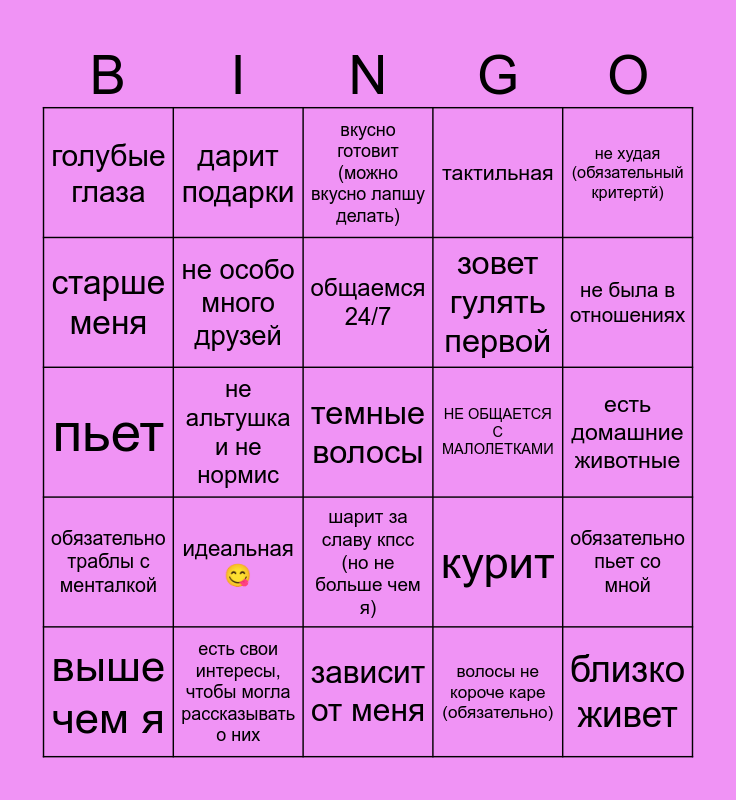 This bingo card has 25 words: идеальная😋, зависит от меня, общаемся 24/7, выше чем я, не худая (обязательный критертй), голубые глаза, старше меня, дарит подарки, НЕ ОБЩАЕТСЯ С МАЛОЛЕТКАМИ, шарит за славу кпсс (но не больше чем я), зовет гулять первой, пьет, курит, обязательно пьет со мной, не особо много друзей, близко живет, есть домашние животные, вкусно готовит (можно вкусно лапшу делать), не была в отношениях, не альтушка и не нормис, темные волосы, есть свои интересы, чтобы могла рассказывать о них, обязательно траблы с менталкой, тактильная and волосы не короче каре (обязательно).
