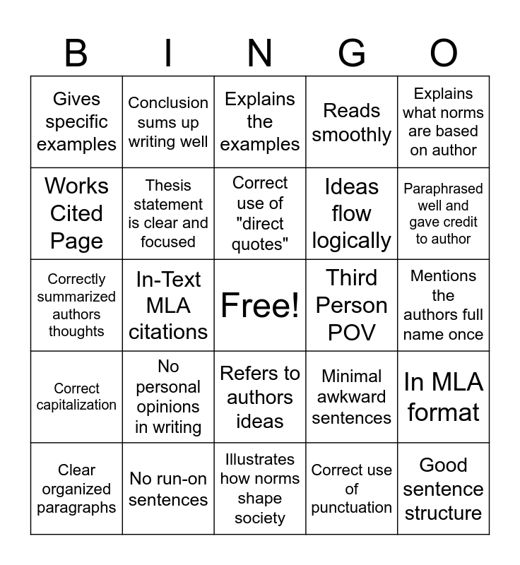 This bingo card has a free space and 24 words: No personal opinions in writing, No run-on sentences, Correct use of "direct quotes", Clear organized paragraphs, Explains what norms are based on author, Gives specific examples, Works Cited Page, Conclusion sums up writing well, Third Person POV, Refers to authors ideas, Ideas flow logically, Correctly summarized authors thoughts, Minimal awkward sentences, In MLA format, Thesis statement is clear and focused, Correct use of punctuation, Mentions the authors full name once, Explains the examples, Paraphrased well and gave credit to author, In-Text MLA citations, Good sentence structure, Correct capitalization, Reads smoothly and Illustrates how norms shape society.