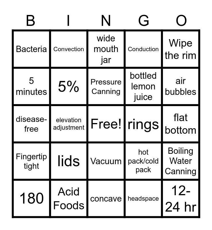This bingo card has a free space and 29 words: 180, National Center for Home Food Preservation, elevation adjustment, low acid foods, Bacteria, wide mouth jar, 5%, lids, rings, Acid Foods, flat bottom, 12-24 hr, concave, headspace, air bubbles, canning salt, Vacuum, Fingertip tight, Wipe the rim, disease-free, hot pack/cold pack, 1 inch above jars, bottled lemon juice, 5 minutes, Conduction, Convection, Boiling Water Canning, Pressure Canning and Mold and Yeast.