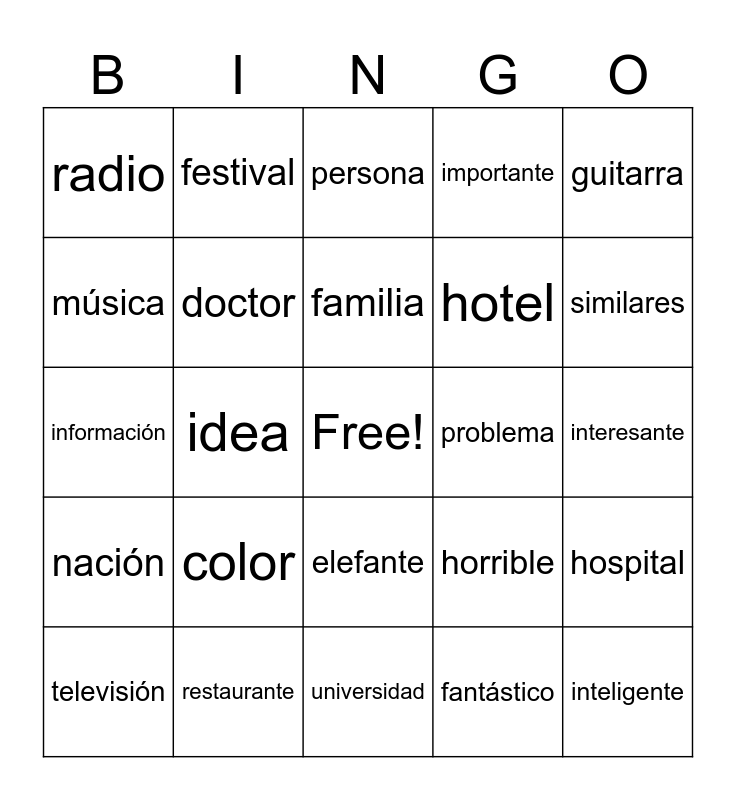 This bingo card has a free space and 38 words: actor, animal, artista, doctor, hospital, color, familia, foto, guitarra, hotel, idea, importante, inteligente, interesante, música, nación, original, persona, popular, problema, radio, restaurante, similares, televisión, tradición, universidad, visita, chocolate, clase, cultura, diferente, elefante, fantástico, festival, general, horrible, información and momento.
