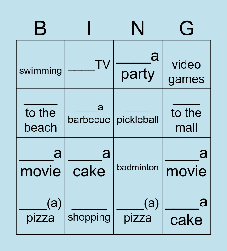 This bingo card has 16 words: ______ shopping, ____a movie, ____a party, ____ swimming, ____a movie, ____TV, _______ badminton, ____(a) pizza, _____ to the beach, ____a barbecue, ____(a) pizza, ____ video games, ____a cake, ____ to the mall, ____ pickleball and ____a cake.