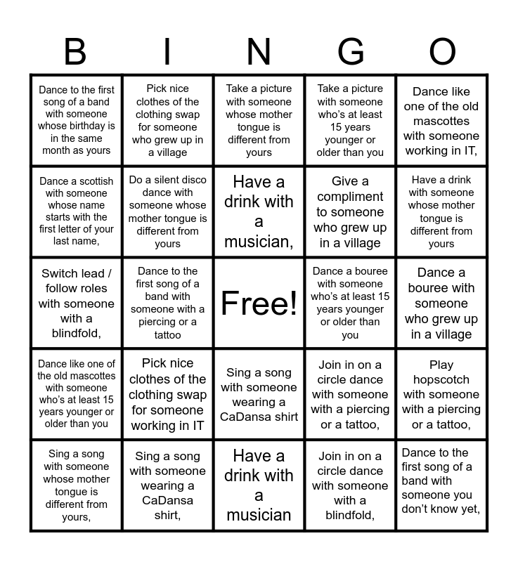 This bingo card has a free space and 182 words: Dance a scottish with someone working in IT,, Dance a scottish with someone who grew up in a village,, Dance a scottish with a CaDansa organiser or volunteer,, Dance a scottish with someone with a blindfold,, Dance a scottish with someone whose name starts with the first letter of your last name,, Dance a scottish with someone with contacts or glasses,, Dance a scottish with someone whose birthday is in the same month as yours,, Have a drink with someone with a piercing or a tattoo,, Have a drink with someone who’s at CaDansa for the first time,, Have a drink with someone wearing a CaDansa shirt,, Have a drink with someone you don’t know yet,, Have a drink with someone whose mother tongue is different from yours,, Have a drink with a musician,, Have a drink with someone who grew up in a village,, Switch lead / follow roles with someone with a blindfold,, Switch lead / follow roles with someone whose name starts with the first letter of your last name,, Switch lead / follow roles with someone who’s at least 15 years younger or older than you,, Switch lead / follow roles with someone with contacts or glasses,, Switch lead / follow roles with someone working in IT,, Switch lead / follow roles with someone who’s at CaDansa for the first time,, Switch lead / follow roles with a CaDansa organiser or volunteer,, Do a silent disco dance with someone with a piercing or a tattoo,, Do a silent disco dance with someone whose birthday is in the same month as yours,, Do a silent disco dance with someone wearing a CaDansa shirt,, Do a silent disco dance with someone you don’t know yet,, Do a silent disco dance with someone who grew up in a village,, Do a silent disco dance with someone with a blindfold,, Do a silent disco dance with someone whose mother tongue is different from yours,, Dance like one of the old mascottes with someone working in IT,, Dance like one of the old mascottes with someone who’s at least 15 years younger or older than you,, Dance like one of the old mascottes with someone with contacts or glasses,, Dance like one of the old mascottes with someone whose name starts with the first letter of your last name,, Dance like one of the old mascottes with someone wearing a CaDansa shirt,, Dance like one of the old mascottes with someone with a piercing or a tattoo,, Dance like one of the old mascottes with someone you don’t know yet,, Give a compliment to someone with a blindfold,, Give a compliment to someone who’s at CaDansa for the first time,, Give a compliment to someone whose mother tongue is different from yours,, Give a compliment to someone working in IT,, Give a compliment to someone with contacts or glasses,, Give a compliment to someone who grew up in a village,, Give a compliment to someone with a piercing or a tattoo,, Dance to the first song of a band with someone whose birthday is in the same month as yours,, Dance to the first song of a band with someone with a piercing or a tattoo,, Dance to the first song of a band with someone wearing a CaDansa shirt,, Dance to the first song of a band with someone you don’t know yet,, Dance to the first song of a band with someone with a blindfold,, Dance to the first song of a band with someone whose name starts with the first letter of your last name,, Dance to the first song of a band with someone working in IT,, Sing a song with someone who’s at least 15 years younger or older than you,, Sing a song with someone whose mother tongue is different from yours,, Sing a song with someone wearing a CaDansa shirt,, Sing a song with someone with contacts or glasses,, Sing a song with someone with a piercing or a tattoo,, Sing a song with someone who grew up in a village,, Sing a song with someone with a blindfold,, Join in on a circle dance with someone whose birthday is in the same month as yours,, Join in on a circle dance with someone with a piercing or a tattoo,, Join in on a circle dance with someone wearing a CaDansa shirt,, Join in on a circle dance with someone you don’t know yet,, Join in on a circle dance with someone with a blindfold,, Join in on a circle dance with someone whose name starts with the first letter of your last name,, Join in on a circle dance with someone working in IT,, Take a picture with someone who’s at least 15 years younger or older than you,, Take a picture with someone whose mother tongue is different from yours,, Take a picture with someone wearing a CaDansa shirt,, Take a picture with someone with contacts or glasses,, Take a picture with someone with a piercing or a tattoo,, Take a picture with someone who grew up in a village,, Take a picture with someone with a blindfold,, Pick nice clothes of the clothing swap for someone who’s at CaDansa for the first time,, Pick nice clothes of the clothing swap for someone whose mother tongue is different from yours,, Pick nice clothes of the clothing swap for someone with contacts or glasses,, Pick nice clothes of the clothing swap for someone with a piercing or a tattoo,, Pick nice clothes of the clothing swap for someone whose birthday is in the same month as yours,, Pick nice clothes of the clothing swap for someone who grew up in a village,, Pick nice clothes of the clothing swap for someone working in IT,, Dance a bouree with someone who’s at least 15 years younger or older than you,, Dance a bouree with someone whose mother tongue is different from yours,, Dance a bouree with someone wearing a CaDansa shirt,, Dance a bouree with someone you don’t know yet,, Dance a bouree with someone with a piercing or a tattoo,, Dance a bouree with someone who grew up in a village,, Dance a bouree with someone with a blindfold,, Play hopscotch with someone who’s at CaDansa for the first time,, Play hopscotch with someone whose mother tongue is different from yours,, Play hopscotch with someone with contacts or glasses,, Play hopscotch with someone with a piercing or a tattoo,, Play hopscotch