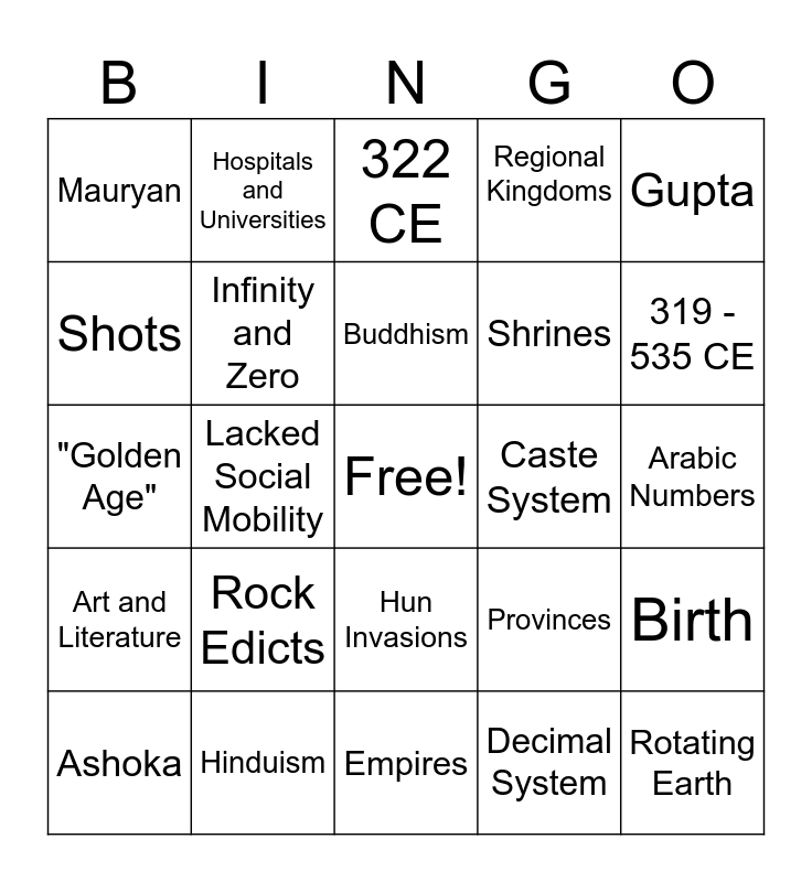 This bingo card has a free space and 24 words: Rock Edicts, Hinduism, Buddhism, Ashoka, Gupta, Mauryan, Shots, Hospitals and Universities, Caste System, Hun Invasions, Shrines, "Golden Age", Provinces, Birth, Infinity and Zero, Decimal System, Arabic Numbers, 322 CE, 319 - 535 CE, Lacked Social Mobility, Rotating Earth, Art and Literature, Regional Kingdoms and Empires.