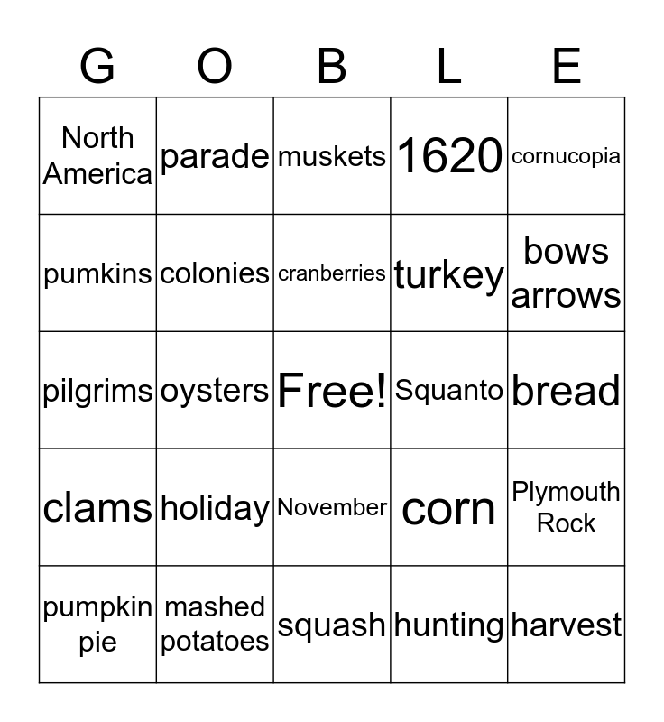 This bingo card has a free space and 24 words: holiday, mashed potatoes, cranberries, pumpkin pie, cornucopia, North America, pumkins, parade, Squanto, November, turkey, pilgrims, corn, Plymouth Rock, colonies, hunting, bread, muskets, bows arrows, oysters, harvest, clams, 1620 and squash.