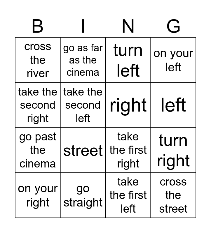 This bingo card has 16 words: go straight, turn right, turn left, cross the river, go past the cinema, go as far as the cinema, take the first right, take the first left, take the second right, take the second left, on your right, on your left, street, left, right and cross the street.