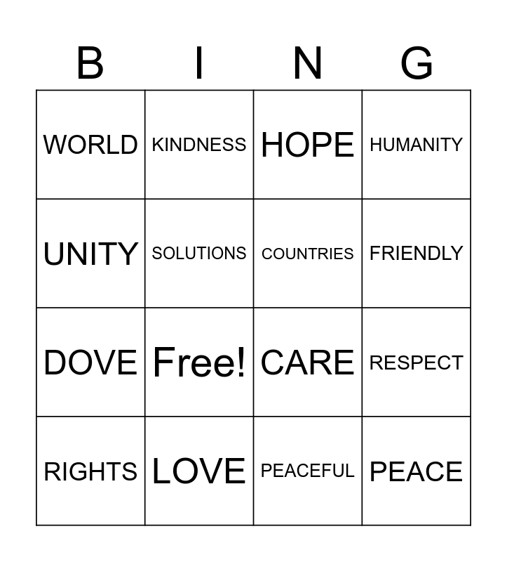 This bingo card has 18 words: Free!, PEACE, HOPE, WORLD, CARE, HUMANITY, RIGHTS, KINDNESS, FRIENDLY, DOVE, PEACEFUL, UNITY, RESPECT, SOLUTIONS, COUNTRIES, STREGHT, LOVE and TRUST.