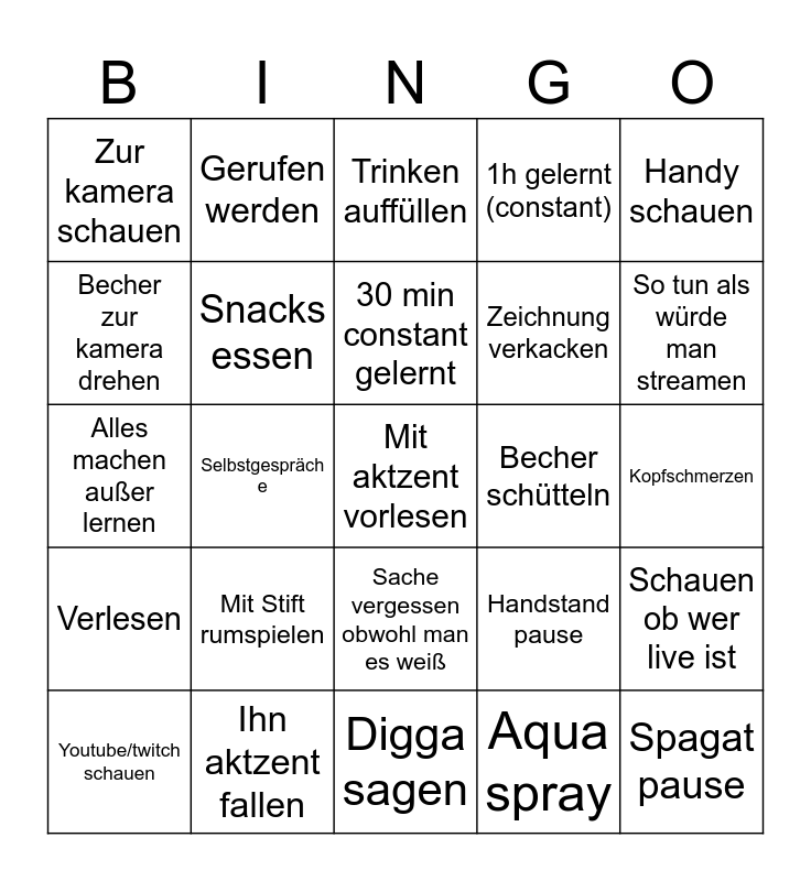 This bingo card has a free space and 24 words: Mit Stift rumspielen, Ihn aktzent fallen, 30 min constant gelernt, Youtube/twitch schauen, Handy schauen, Zur kamera schauen, Becher zur kamera drehen, Gerufen werden, Becher schütteln, Sache vergessen obwohl man es weiß, Zeichnung verkacken, Alles machen außer lernen, Handstand pause, Schauen ob wer live ist, Snacks essen, Aqua spray, Kopfschmerzen, Trinken auffüllen, So tun als würde man streamen, Selbstgespräch e, Spagat pause, Verlesen, 1h gelernt (constant) and Digga sagen.