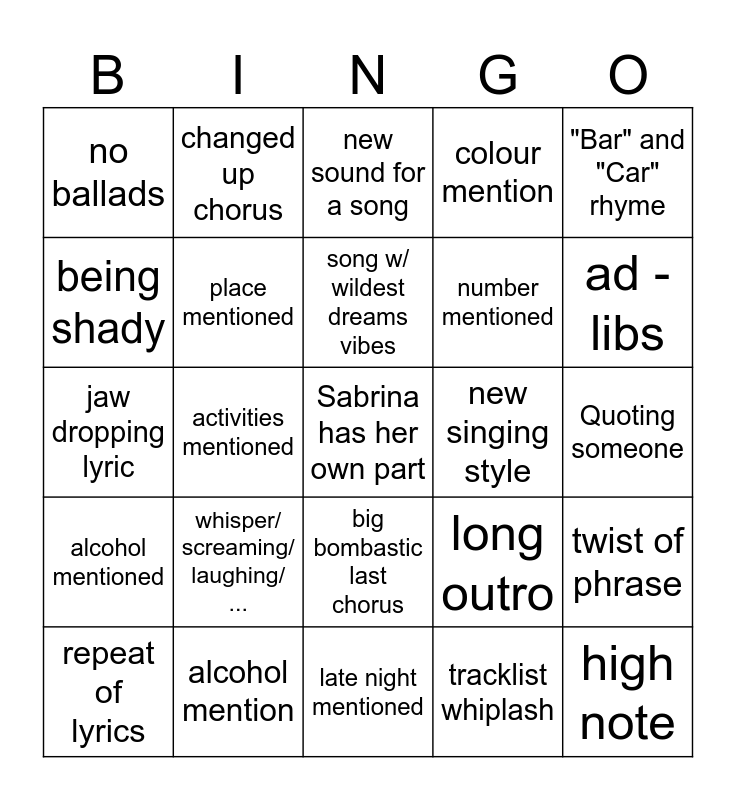 This bingo card has a free space and 24 words: whisper/ screaming/ laughing/ ..., alcohol mention, song w/ wildest dreams vibes, repeat of lyrics, "Bar" and "Car" rhyme, no ballads, being shady, changed up chorus, new singing style, big bombastic last chorus, number mentioned, jaw dropping lyric, long outro, twist of phrase, place mentioned, tracklist whiplash, Quoting someone, new sound for a song, ad - libs, activities mentioned, high note, alcohol mentioned, colour mention and late night mentioned.