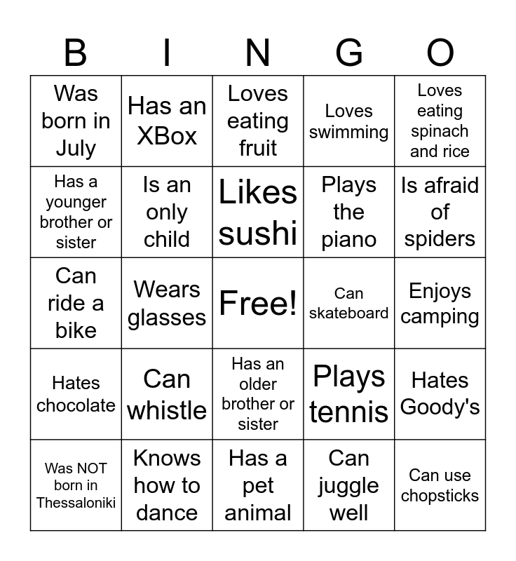 This bingo card has a free space and 24 words: Can whistle, Knows how to dance, Likes sushi, Was NOT born in Thessaloniki, Loves eating spinach and rice, Was born in July, Has a younger brother or sister, Has an XBox, Can skateboard, Has an older brother or sister, Plays the piano, Can ride a bike, Plays tennis, Hates Goody's, Is an only child, Can juggle well, Enjoys camping, Loves eating fruit, Is afraid of spiders, Wears glasses, Can use chopsticks, Hates chocolate, Loves swimming and Has a pet animal.
