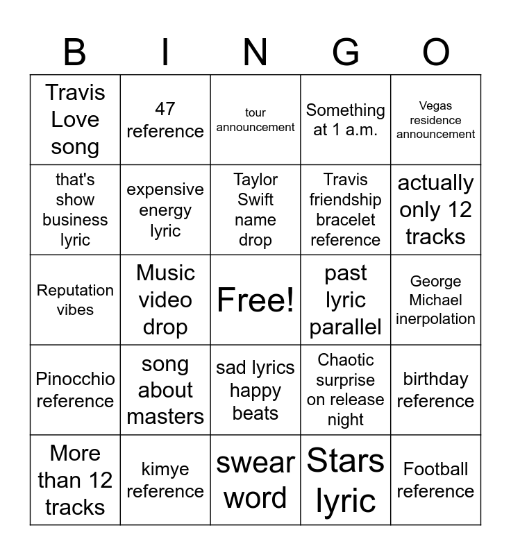 This bingo card has a free space and 29 words: More than 12 tracks, Devastating Bop, Music video drop, Blake betrayal song, Travis Love song, tour announcement, expensive energy lyric, song about masters, past lyric parallel, kimye reference, George Michael inerpolation, Football reference, swear word, Stars lyric, actually only 12 tracks, Super Bowl announcement, sad lyrics happy beats, Pinocchio reference, Vegas residence announcement, Reputation vibes, Chaotic surprise on release night, city name drop, Travis friendship bracelet reference, that's show business lyric, Something at 1 a.m., 47 reference, birthday reference, Taylor Swift name drop and Rep vault tracks.