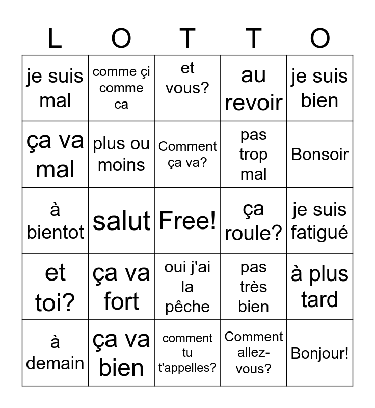 This bingo card has a free space and 26 words: oui j'ai la pêche, Comment allez-vous?, Comment ça va?, ça va bien, je suis bien, je suis mal, ça va mal, comme çi comme ca, je suis fatigué, pas très bien, pas trop mal, à bientot, à plus tard, à demain, salut, très bien, au revoir, et toi?, et vous?, Bonjour!, Bonsoir, comment tu t'appelles?, ça roule?, ça va fort, plus ou moins and bonne journée.