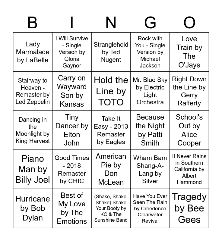 This bingo card has 61 words: Come and Get Your Love - Single Version by Redbone, Best of My Love by The Emotions, Rich Girl by Daryl Hall & John Oates, Piano Man by Billy Joel, Have You Ever Seen The Rain by Creedence Clearwater Revival, Ain't No Sunshine by Bill Withers, Carry on Wayward Son by Kansas, It's Too Late by Carole King, Mr. Blue Sky by Electric Light Orchestra, Easy by Commodores, Rock with You - Single Version by Michael Jackson, Hotel California - 2013 Remaster by Eagles, Stairway to Heaven - Remaster by Led Zeppelin, Lovely Day by Bill Withers, Rocket Man (I Think It's Going To Be A Long, Long Time) by Elton John, Lady Marmalade by LaBelle, Take It Easy - 2013 Remaster by Eagles, Love Train by The O'Jays, Got to Be Real by Cheryl Lynn, Hold the Line by TOTO, Because the Night by Patti Smith, Stranglehold by Ted Nugent, Hurricane by Bob Dylan, It Never Rains in Southern California by Albert Hammond, Wheel in the Sky (2024 Remaster) by Journey, Evil Woman by Electric Light Orchestra, Do Ya Think I'm Sexy by Rod Stewart, Dreams - 2004 Remaster by Fleetwood Mac, Right Down the Line by Gerry Rafferty, Stuck In The Middle With You by Stealers Wheel, Only the Good Die Young by Billy Joel, Baby Come Back by Player, A Horse with No Name by America; George Martin, December, 1963 (Oh What a Night!) by The Four Seasons, I Will Survive - Single Version by Gloria Gaynor, You're So Vain by Carly Simon, Bennie And The Jets - Remastered 2014 by Elton John, Tiny Dancer by Elton John, Gimme! Gimme! Gimme! (A Man After Midnight) by ABBA, Dancing in the Moonlight by King Harvest, What You Won't Do for Love by Bobby Caldwell, Good Times - 2018 Remaster by CHIC, School's Out by Alice Cooper, Rasputin by Boney M., Wham Bam Shang-A-Lang by Silver, T.N.T. by AC/DC, I'm Every Woman by Chaka Khan, Knockin' On Heaven's Door by Bob Dylan, My Life by Billy Joel, American Pie by Don McLean, (Shake, Shake, Shake) Shake Your Booty by KC & The Sunshine Band, All Right Now by Free, Roxanne by The Police, Beast Of Burden - Remastered 1994 by The Rolling Stones, Cocaine by Eric Clapton, Sweet Emotion by Aerosmith, Right Back Where We Started From by Maxine Nightingale, More Than A Woman by Bee Gees, Southern Nights by Glen Campbell, Tragedy by Bee Gees and Fortunate Son by Creedence Clearwater Revival.