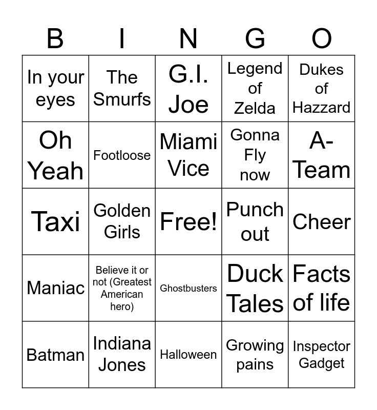 This bingo card has a free space and 42 words: Magnum P.I., Miami Vice, Knight rider, Believe it or not (Greatest American hero), Growing pains, Facts of life, Inspector Gadget, Transformers, G.I. Joe, Ghostbusters, Cheer, A-Team, Golden Girls, Dukes of Hazzard, Three's Company, Duck Tales, Murder, she wrote, Taxi, Doogie Howser M.D., The Smurfs, Oh Yeah, Don't you (Forget about me), The power of love, In your eyes, Axel F-Beverly Hills Cop, Chariots of Fire, Gonna Fly now, Danger zone, Eye of the tiger, The Goonies are Good enough, You're the best, Maniac, Footloose, Halloween, Purple rain, Batman, Indiana Jones, Punch out, Super Mario Bros, Underground theme, Legend of Zelda and Tetris.