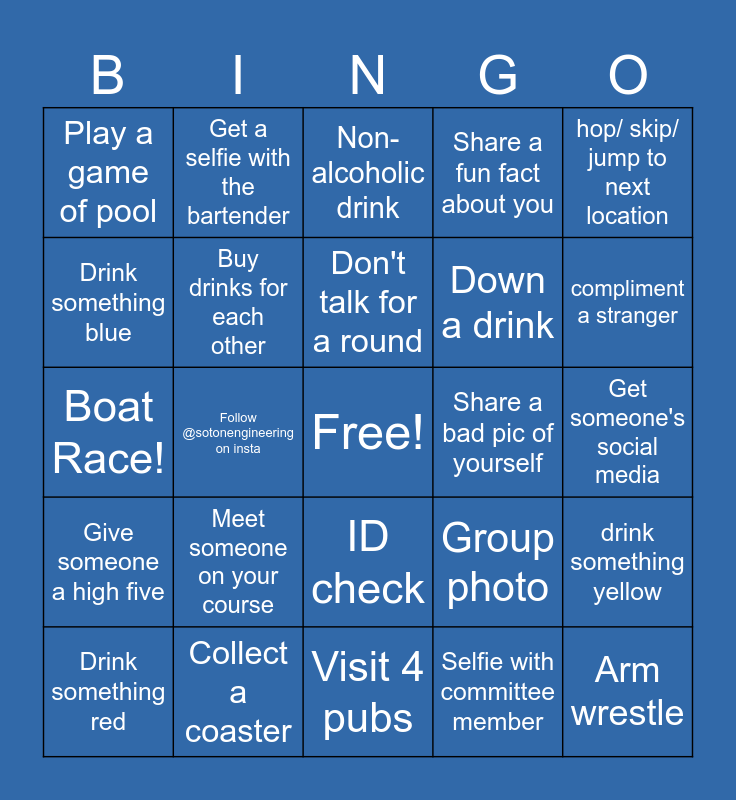 This bingo card has a free space and 24 words: Meet someone on your course, Collect a coaster, Don't talk for a round, Drink something red, hop/ skip/ jump to next location, Play a game of pool, Drink something blue, Get a selfie with the bartender, Share a bad pic of yourself, ID check, Down a drink, Boat Race!, Group photo, drink something yellow, Buy drinks for each other, Selfie with committee member, Get someone's social media, Non- alcoholic drink, compliment a stranger, Follow @sotonengineering on insta, Arm wrestle, Give someone a high five, Share a fun fact about you and Visit 4 pubs.