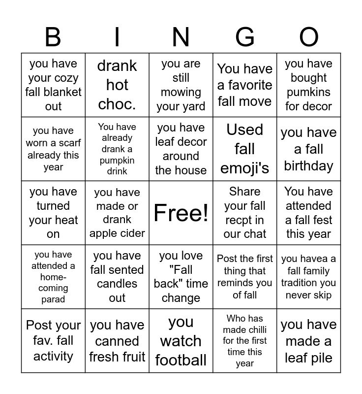 This bingo card has a free space and 24 words: you have fall sented candles out, you have canned fresh fruit, you have leaf decor around the house, Post your fav. fall activity, you have bought pumkins for decor, you have your cozy fall blanket out, you have worn a scarf already this year, drank hot choc., Share your fall recpt in our chat, you love "Fall back" time change, Used fall emoji's, you have turned your heat on, Post the first thing that reminds you of fall, you havea a fall family tradition you never skip, You have already drank a pumpkin drink, Who has made chilli for the first time this year, You have attended a fall fest this year, you are still mowing your yard, you have a fall birthday, you have made or drank apple cider, you have made a leaf pile, you have attended a home-coming parad, You have a favorite fall move and you watch football.