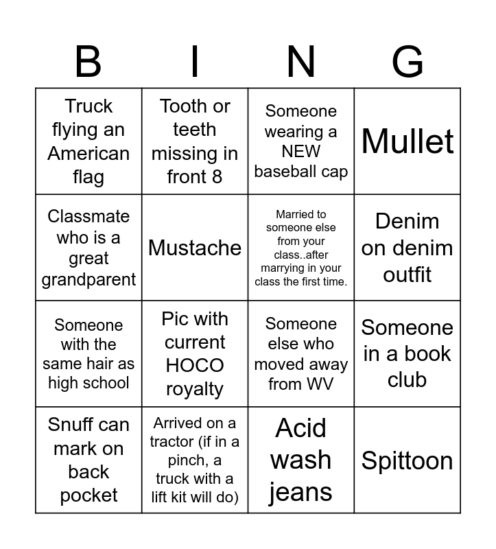 This bingo card has 16 words: Arrived on a tractor (if in a pinch, a truck with a lift kit will do), Someone in a book club, Someone wearing a NEW baseball cap, Truck flying an American flag, Someone with the same hair as high school, Tooth or teeth missing in front 8, Someone else who moved away from WV, Acid wash jeans, Classmate who is a great grandparent, Mustache, Snuff can mark on back pocket, Mullet, Pic with current HOCO royalty, Denim on denim outfit, Married to someone else from your class..after marrying in your class the first time. and Spittoon.