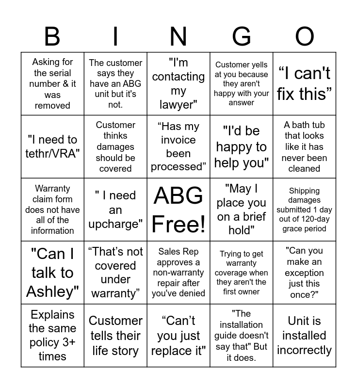 This bingo card has a free space and 24 words: “That’s not covered under warranty”, Customer tells their life story, “Has my invoice been processed”, Explains the same policy 3+ times, “I can't fix this”, Asking for the serial number & it was removed, "I need to tethr/VRA", The customer says they have an ABG unit but it's not., "May I place you on a brief hold", Sales Rep approves a non-warranty repair after you've denied, "I'd be happy to help you", Warranty claim form does not have all of the information, Trying to get warranty coverage when they aren't the first owner, "Can you make an exception just this once?", Customer thinks damages should be covered, "The installation guide doesn't say that" But it does., Shipping damages submitted 1 day out of 120-day grace period, "I'm contacting my lawyer", A bath tub that looks like it has never been cleaned, " I need an upcharge", Unit is installed incorrectly, "Can I talk to Ashley", Customer yells at you because they aren't happy with your answer and “Can’t you just replace it".