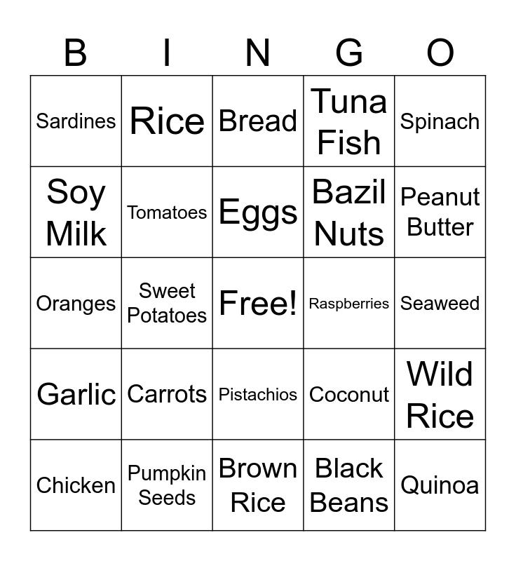This bingo card has a free space and 74 words: Apples, Avocado, Bread, Beans, Milk, Blueberries, Broccoli, Cereal, Chicken, Cottage Cheese, Cantaloupe, Corn, Eggs, Soy Milk, Grapes, Sweet Potatoes, Popcorn, Peanut Butter, Cheese, Oranges, Tomatoes, Rice, Tuna Fish, Yogurt, Quinoa, Kale, Salmon, Almonds, Greek Yogurt, Chia Seeds, Spinach, Walnuts, Oatmeal, Tofu, Cauliflower, Black Beans, Brussels Sprouts, Lentils, Edamame, Flaxseeds, Brown Rice, Pumpkin Seeds, Mushrooms, Asparagus, Turkey Breast, Sardines, Green Tea, Carrots, Beets, Shrimp, Artichokes, Bell Peppers, Seaweed, Hummus, Barley, Mangoes, Pistachios, Kiwi, Grapefruit, Wild Rice, Bazil Nuts, Cabbage, Garlic, Zucchini, Raspberries, Pineapple, Hazlenus, Pinto Beans, Coconut, Cashews, Sunflower Seeds, Arugula, Red Cabbage and Peas.