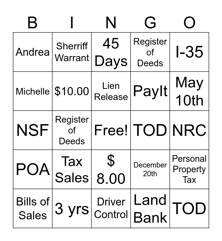 This bingo card has a free space and 29 words: Bills of Sales, Lien Relase, Register of Deeds, NSF, Andrea, 45 Days, $10.00, Tax Sales, TOD, 3 yrs, NRC, TOD, Driver Control, Land Bank, May 10th, Sheriff Warrant, $ 8.00, POA, I-35, NSF, December 20th, Quiet Title, PayIt, Michelle, Register of Deeds, Sherriff Warrant, Personal Property Tax, Lien Release and Affidavit to Fact.