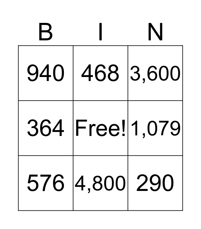 This bingo card has a free space and 8 words: 1,079, 3,600, 468, 576, 940, 290, 364 and 4,800.