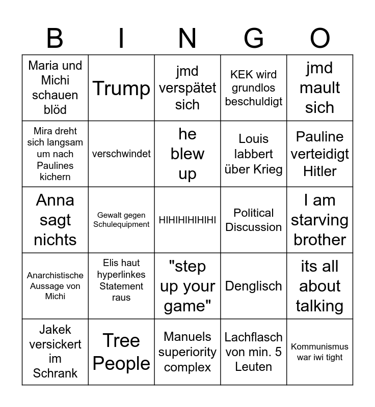 This bingo card has a free space and 24 words: Elis haut hyperlinkes Statement raus, Tree People, he blew up, Jakek versickert im Schrank, jmd mault sich, Maria und Michi schauen blöd, Mira dreht sich langsam um nach Paulines kichern, Trump, Political Discussion, "step up your game", Louis labbert über Krieg, Anna sagt nichts, Denglisch, its all about talking, verschwindet, Lachflasch von min. 5 Leuten, I am starving brother, jmd verspätet sich, Pauline verteidigt Hitler, Gewalt gegen Schulequipment, Kommunismus war iwi tight, Anarchistische Aussage von Michi, KEK wird grundlos beschuldigt and Manuels superiority complex.