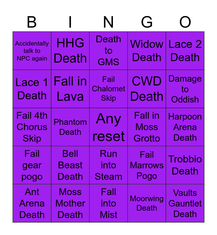 This bingo card has a free space and 24 words: Bell Beast Death, Moss Mother Death, Fail Chalomet Skip, Ant Arena Death, Lace 2 Death, Accidentally talk to NPC again, Lace 1 Death, HHG Death, Fall in Moss Grotto, Run into Steam, CWD Death, Fail 4th Chorus Skip, Fail Marrows Pogo, Trobbio Death, Fall in Lava, Moorwing Death, Harpoon Arena Death, Death to GMS, Damage to Oddish, Phantom Death, Vaults Gauntlet Death, Fail gear pogo, Widow Death and Fall into Mist.