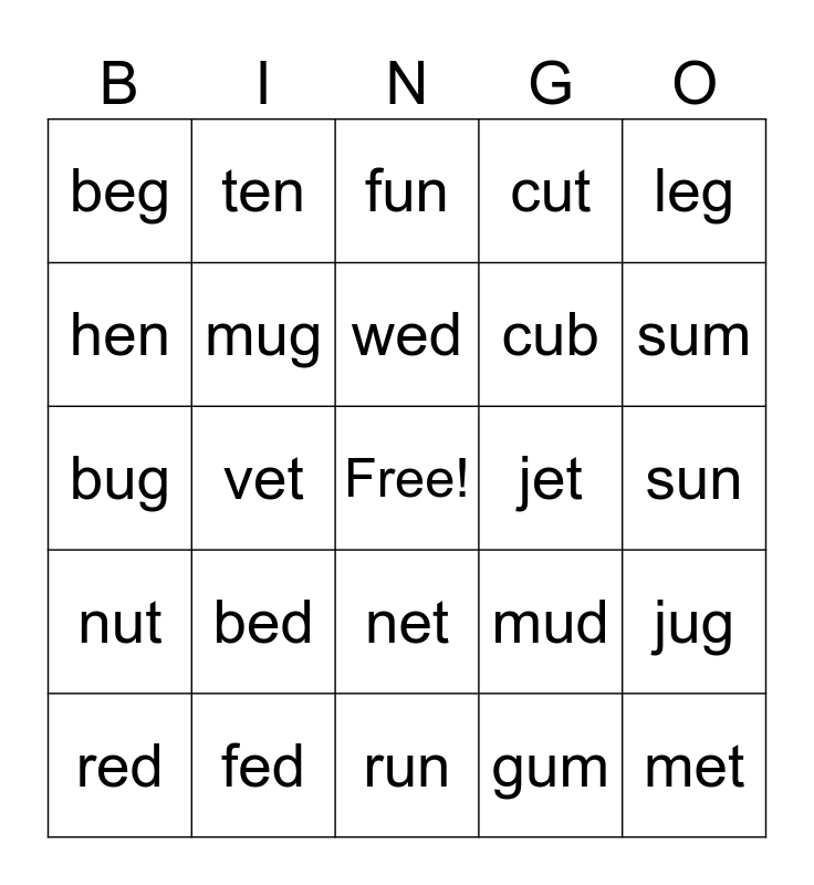 This bingo card has a free space and 24 words: bed, fed, wed, red, leg, beg, hen, ten, jet, net, cub, bug, mud, jug, mug, gum, sun, fun, sum, vet, met, nut, cut and run.
