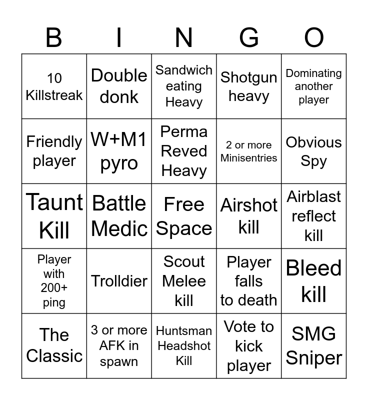 This bingo card has a free space and 29 words: The Classic, Bison Soldier, Battle Medic, Overused Sentry Spot, 10 Killstreak, Sandwich eating Heavy, W+M1 pyro, Trolldier, Airshot kill, 3 or more AFK in spawn, Airblast reflect kill, SMG Sniper, Huntsman Headshot Kill, Vote to kick player, Obvious Spy, 3+ Spies, Scout Melee kill, Player with 200+ ping, Dominating another player, Taunt Kill, Player falls to death, Gibus, 2 or more Minisentries, Friendly player, Shotgun heavy, Double donk, Bleed kill, Perma Reved Heavy and Taunt after a kill.
