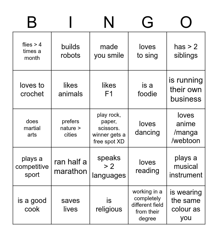 This bingo card has a free space and 24 words: ran half a marathon, saves lives, likes F1, is a good cook, has > 2 siblings, flies > 4 times a month, loves to crochet, builds robots, loves dancing, speaks > 2 languages, is a foodie, does martial arts, loves reading, plays a musical instrument, likes animals, working in a completely different field from their degree, loves anime /manga /webtoon, made you smile, is running their own business, prefers nature > cities, is wearing the same colour as you, plays a competitive sport, loves to sing and is religious.